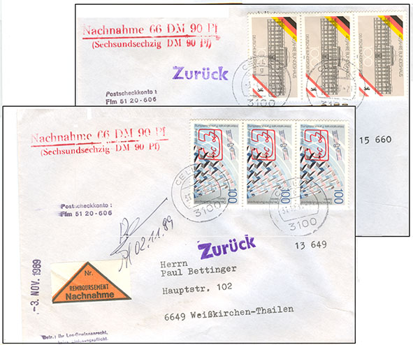 Mi. 847, 867 2 Briefe Mehrfachfrankatur Nachnahme